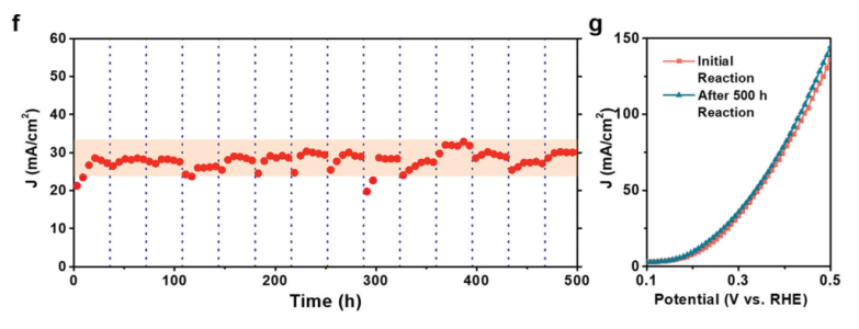 2法拉第效率,并保持了500小時以上的長期耐久性,而沒有任何衰減。密度泛函理論計算表明,CoNi和氮摻雜劑協(xié)同促進了石墨烯表面上多硫化物的形成。此外,具有1200 h的穩(wěn)定性,可通過這種石墨烯包裹的金屬催化劑從工業(yè)合成氣中除去H
