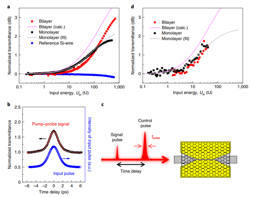 2)。由于極端的光限制,我們大大增強了石墨烯中的光學非線性吸收,并以35 fJ的開關能量和260 fs的開關時間,實現了超快的全光開關。開關能量比以前基于石墨烯的器件小四個數量級,并且是所有在幾皮秒或更短時間內運行的全光開關的最小值。該器件可以有效地連接到常規的硅波導,并可以用在硅光子集成電路中。我們相信,這種基于石墨烯的器件將為芯片的超快和高能效的光子處理鋪平道路。