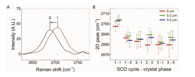 Figure 4. 不同間隔層厚度的無(wú)電極器件在多重自旋交叉作用下的拉曼光譜研究。A)在第一個(gè)SCO周期中,相I的2D峰值為243 K,相II的峰值為223 K。B)多次躍遷后的2D峰值。