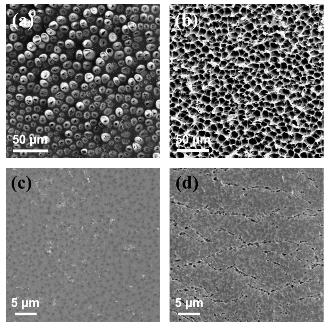 Figure 4. (a)使用錯誤的配方通過IP技術制得的PES膜的SEM圖像。內在應力引起薄膜變形,石墨烯沒有粘附在PES膜上。(b)凝結后從PES復合膜石上剝離的石墨烯相互接觸(c)PES石墨烯復合膜的SEM圖像,孔徑約為500 nm,孔率較低。(d)PES石墨烯復合膜的SEM圖像,孔徑約為500 nm且具有高孔隙率的,會導致石墨烯缺陷。
