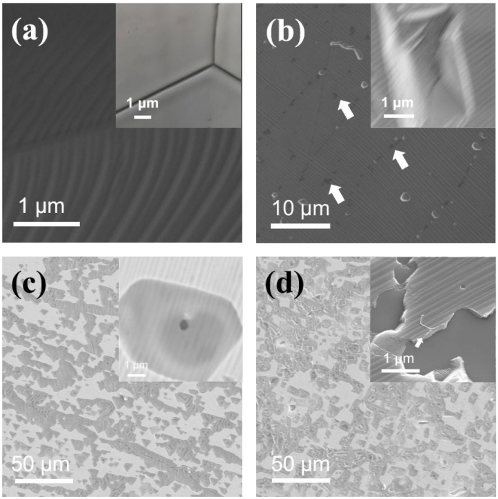 Figure 3.銅蝕刻導致石墨烯缺陷的演變。(a)石墨烯銅的SEM圖像,插圖是石墨烯晶界的光學顯微圖像。(b)石墨烯銅接觸硫代硫酸鈉(10g / 100mL)持續0.5秒后的SEM圖像。 插圖是蝕刻后產生的孔上懸浮石墨烯的特寫。(c)銅與硫代硫酸鈉(10g / 100mL)接觸1秒后的SEM圖像。插圖是懸空區域針孔的特寫。(d)石墨烯銅與硫代硫酸鈉(10g / 100mL)接觸3秒后的SEM圖像。插圖是石墨烯銅的孔上覆蓋的完全破碎的石墨烯的特寫。(箭頭指向石墨烯的殘留物)。