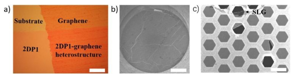 Figure 2. a)300 nm SiO2 / Si襯底上圖案化的2DP1-石墨烯異質結構的光學顯微圖像。b,c)自由懸浮在銅網上的2DP1-石墨烯異質結構膜的SEM圖像。a),b)和c)中的比例尺分別為200 μm,1 mm和40 μm。