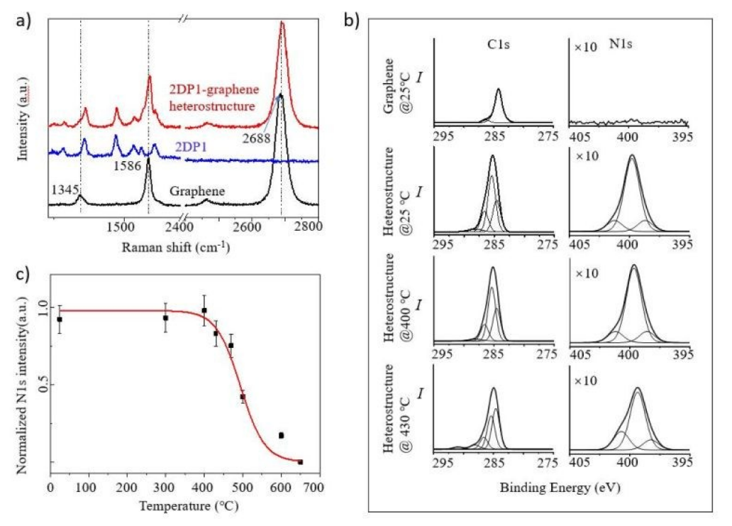 Figure 3. a)石墨烯,2DP1和2DP1-石墨烯異質結構的拉曼光譜。b)石墨烯和2DP1-在不同溫度下退火1小時前后的X射線光電子能譜。N1s信號的強度(I)被放大了10倍。c)不同退火溫度下的2DP1-石墨烯異質結構N1s信號的歸一化強度。