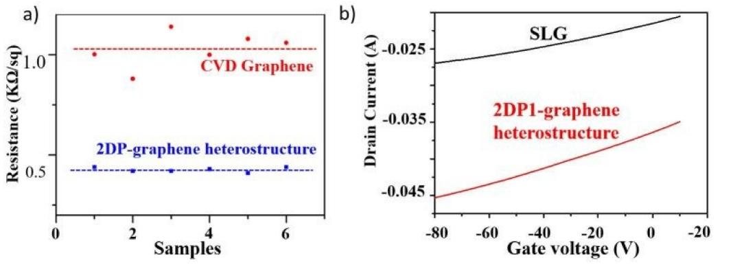 2/Si襯底上的石墨烯和2DP1-石墨烯異質結構的電阻。b)300 nm SiO