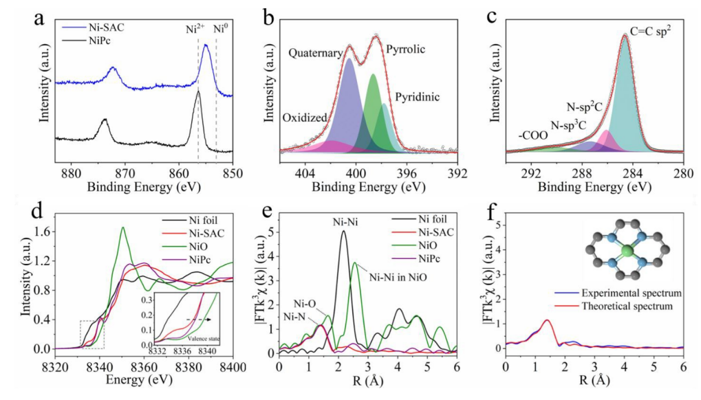 Figure 3. (a,b,c)Ni-SAC的Ni 2p,N 1s和C 1s XPS光譜。(d)在Ni-SAC的Ni K邊緣處歸一化的XANES光譜,插圖顯示放大圖。(e)Ni-SAC的k