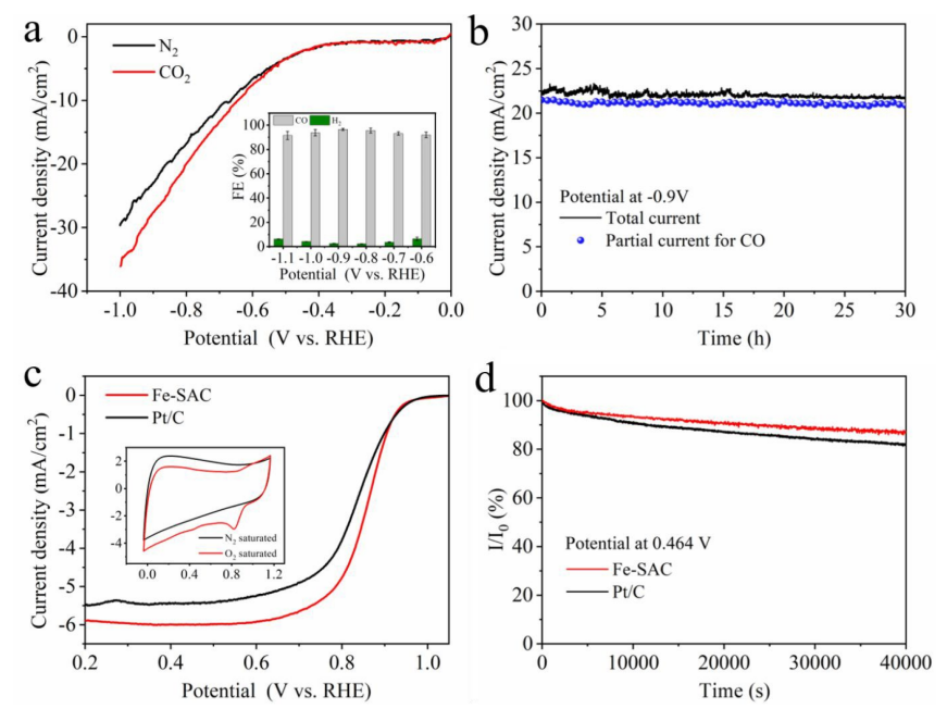 2(綠色條)的法拉第效率隨電位的變化。(b)穩(wěn)定性測試。(C)Fe-SAC和Pt/C在O
