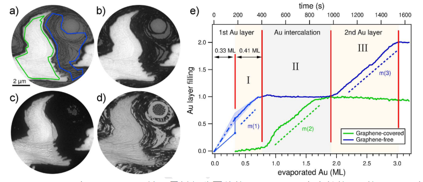 Figure 2. (a-d)在1030 K下,被石墨烯部分覆蓋的Ru(0001)上生長的Au的 LEEM序列。表面.Au的蒸發量從a)到d)依次為0.33 ML,0.55 ML,1.17 ML和2.14 ML。 在(c)中石墨烯島上的淺灰色部分為插入的前端部位。e)填充在石墨烯鱗片內外的金層的演變過程可以從(a)中標出的特定區域的LEEM強度上推算出來。
