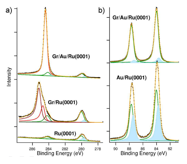 Figure 4. a)C 1s和Ru 3d的XPS光譜。b)Au 4f的XPS光譜。光子能量為335 eV。 在左面板的底部還顯示了潔凈的Ru的光譜,以突出C 1s峰的貢獻。裸露和插入的金厚度均為兩層。 所有表面內核能級偏移的組分以淺藍色表示。