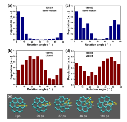 銅箔是用于合成大面積,高質量單層石墨烯的最有前途的催化劑。實驗發現,Cu襯底在石墨烯生長溫度下呈半熔融狀態。在本研究中,我們基于自主研發的C-Cu經驗勢與密度泛函理論(DFT)方法,對納米石墨烯進行了系統的分子動力學模擬,以探索石墨烯納米結構(即碳納米團簇和石墨烯納米帶)在半熔融Cu基體上的穩定性。在經典的MD模擬中觀察到的許多原子細節與在DFT-MD模擬中觀察到的一致,這證實了C-Cu勢的高精度。根據石墨烯島的大小,可以觀察到兩種不同的下陷模式:(i)石墨烯島下沉到金屬基底的第一層,(ii)石墨烯島周圍有許多金屬原子。進一步研究發現,石墨烯的下沉導致了石墨烯島的單向排列和無縫拼接,這解釋了大型單晶石墨烯在Cu箔上的生長。這項研究加深了我們對石墨在半熔融Cu襯底上的CVD生長物理認識,并充分解釋了多個實驗謎團,并為大面積單晶單層石墨烯的受控合成提供了理論參考。