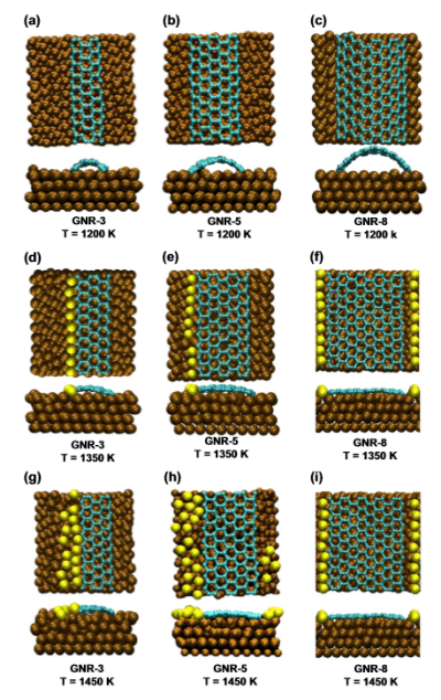 Fig. 5 在不同溫度下,半熔融Cu基板上的石墨烯納米帶(GNR)。