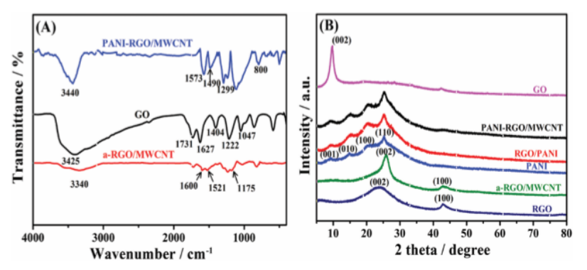 Fig. 2 (A) GO、a-RGO/MWCNT和PANI-RGO/MWCNT的FT-IR光譜。(B)不同樣品的XRD圖譜。