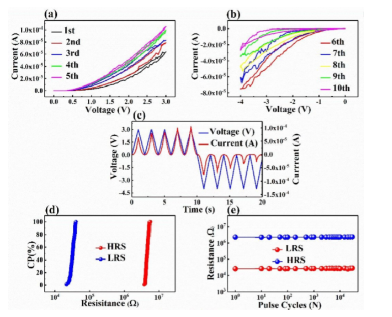 Fig. 2 (a-b)在直流模式下,0-3V-0正電壓連續掃描5次,0-4V-0負電壓連續掃描5次。(c)提取(a-b)中的電流和電壓數據,繪制與時間的關系。(d)抗性的統計分布。(e) 5×10