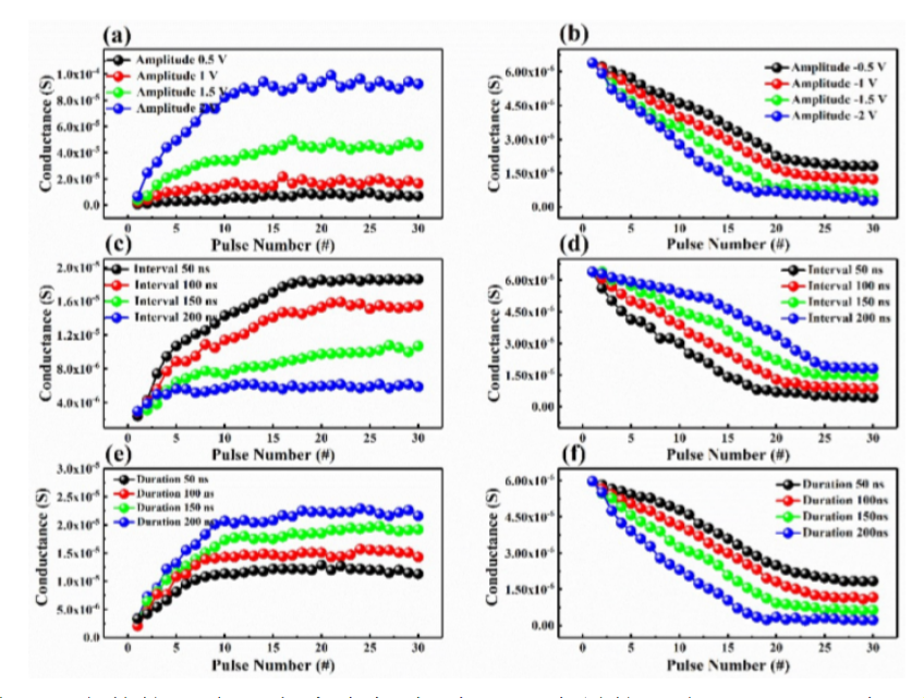 Fig. 3 調整不同參數的正/負雙向脈沖序列對憶阻器電導的影響。(a-b)不同電壓幅值對電導調制的影響。(c-d)不同脈沖間隔對電導調制的影響。(e-f)不同脈沖寬度對電導調制的影響。