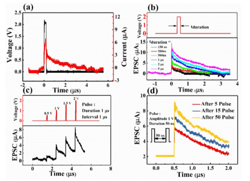 Fig. 4 (a)突觸前脈沖刺激產生的EPSC特性。(b)不同脈沖持續時間的突觸前脈沖觸發EPSC,脈沖幅度為2V。(c)不同電壓下程序設計脈沖產生的EPSC。(d)在同一脈沖下分別施加5、15、50個脈沖下,獲得的EPSC衰減。