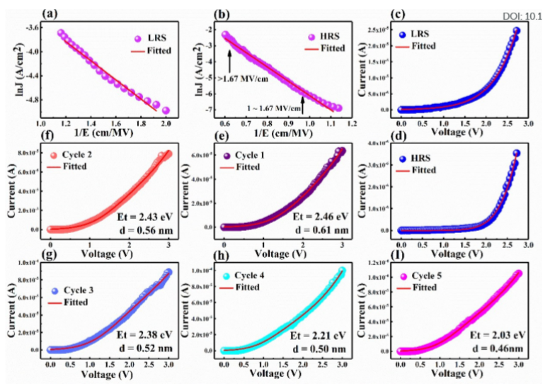 Fig. 5 機理解釋。(a-b) TAT機制。(c-d)對I-V曲線的LRS和HRS進行擬合。(e-I)對于五個連續正電壓掃描周期的I-V曲線,進行周期1到周期5的擬合曲線。