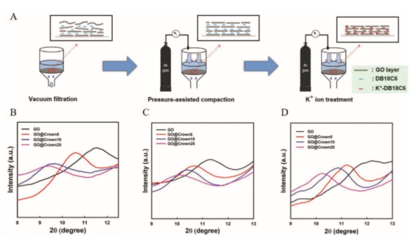 Figure 2. A)通過真空過濾和其他工藝制備復合膜的原理圖。基于制備各階段的純凈GO和復合膜的XRD光譜:B)真空過濾后,C)壓力輔助壓實后,D) K