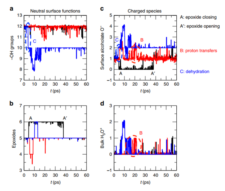 Figure 4. 氧化石墨烯在液體水中的動力學過程。GO表面中性官能團(左圖)數(shù)量隨時間的演變情況,GO表面或在水中的帶電荷物質(zhì)數(shù)量隨時間的演變情況(右圖)。(a)–OH官能團,(b)環(huán)氧化合物,(c)表面醇化物,(d)H3O+。