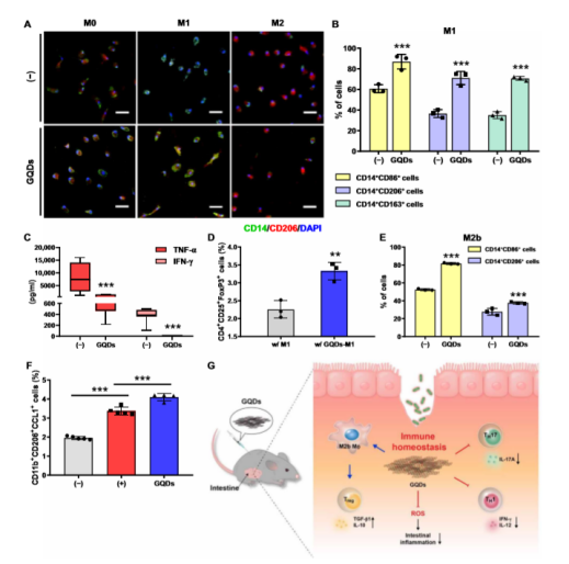 regs)的腸道浸潤。因此,GQDs可以通過調節免疫細胞有效地減輕過度炎癥反應,這表明GQDs可以作為包括IBDs在內的自身免疫性疾病的替代治療藥物。