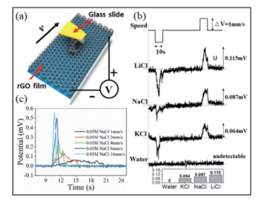 Fig. 3 在rGO薄膜上移動離子溶液液滴產生電壓。(a)用于產生電壓的實驗裝置的示意圖。(b)拖動四種液滴(LiCl、NaCl、KCl、純水)在rGO薄膜上交替滑動產生的電壓曲線。(c)拖動0.05 M NaCl溶液的液滴所產生的電壓。