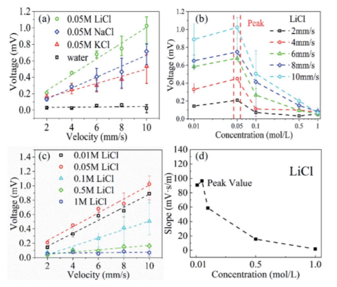 Fig. 4拖動離子溶液液滴在rGO膜上滑動引起感應電壓的影響因素。(a)四種水滴(LiCl、NaCl、KCl、純水)的感應電壓幅值與滑動速度的關系。(b)感應電壓幅值與五種不同滑移速度下LiCl液滴濃度的關系。(c)五種濃度下LiCl液滴的誘導電壓幅值與滑動速度的關系。(d) (c)所示擬合線斜率與LiCl液滴濃度的關系。