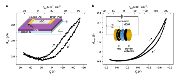 Fig. 2 單層rGO的常規背柵與多層rGO膜的電解質柵的比較。
