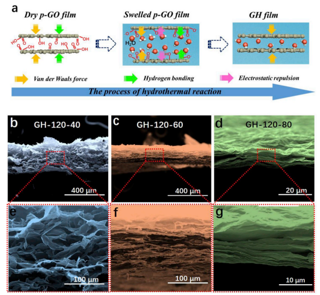 Figure 2. (a)在水熱反應過程中石墨烯薄膜的層間演變示意圖。(b–g)具有不同HPT的GH薄膜的橫截面SEM圖像。