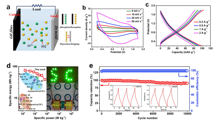-2的高面積電容。基于薄膜的鋅離子混合超級電容器(ZHSs)具有99.3 mAh/g的大容量和76.2 Wh/kg的高比能。此外,在經過10,000次充電/放電循環后,ZHS具有出色的容量保持率,約為90%。這些結果表明,利用GO膜的溶脹行為構造獨特結構的GH膜是制備電極材料的一種創新,簡單而實用的技術。