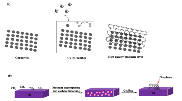 Figure 2. 通過(guò)CVD程序?qū)Γ╝)銅和(b)鎳上的金屬原子和石墨烯形成的模板作用說(shuō)明。