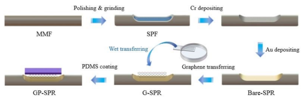 Figure1. GP-SPR光纖傳感器的制造過(guò)程,包括拋光纖維包層,沉積Cr和金膜,石墨烯轉(zhuǎn)移和涂覆PDMS層。