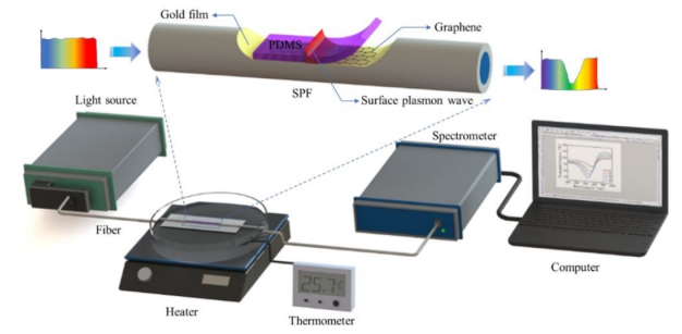 通過(guò)涂覆石墨烯和聚二甲基硅氧烷(PDMS)到光纖等離子體界面上,開(kāi)發(fā)了一種高靈敏度,快響應(yīng)速度的光纖等離子體溫度傳感器。該傳感器由側(cè)面拋光纖維,金層,石墨烯層和PDMS層四部分組成,依次分別用于光激發(fā)和讀出,激發(fā)表面等離振子共振(SPR),增強(qiáng)SPR效應(yīng)和加速傳感響應(yīng),充當(dāng)熱-光響應(yīng)材料。發(fā)現(xiàn),隨著石墨烯層數(shù)增加(4層以內(nèi)),其折射率(RI)的靈敏度增加,但進(jìn)一步增加石墨烯層數(shù),其靈敏度反而降低。引入PDMS外涂層后,四層石墨烯可以提高RI傳感器的靈敏度(33%),溫度靈敏度提高了21.9%。此外,引入石墨烯層后,縮短了溫度傳感器的響應(yīng)時(shí)間,從65至6 s(達(dá)一個(gè)數(shù)量級(jí)以上)。可以相信,該多層石墨烯/PDMS結(jié)構(gòu)可以進(jìn)一步開(kāi)發(fā)用于優(yōu)化其他溫度傳感器的靈敏度和響應(yīng)時(shí)間。