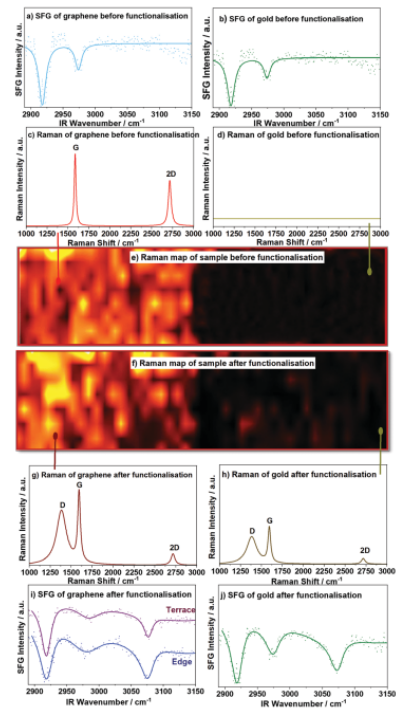 Figure1. 石墨烯邊緣附近的SFG和拉曼光譜以及拉曼漫譜圖。(a和b)原始石墨烯和金基底側(cè)面的vSFG光譜,都能發(fā)現(xiàn)烴雜質(zhì)。(c)石墨烯側(cè)面和(d)金基底側(cè)面(無石墨烯貢獻)的單點光譜。(e)功能化之前G峰強度的拉曼漫譜。(f)功能化之后D峰的拉曼漫譜,(g)顯示了在功能化石墨烯中存在缺陷激活的D峰,(h)在金基底側(cè)面有較弱的石墨烯峰,表明一些石墨烯薄片已經(jīng)轉(zhuǎn)移金基底上。(i)苯基官能化石墨烯在臺階位和邊緣處和(j)金基板上的vSFG光譜,在光譜中顯示了芳烴C-H拉伸振動強度的變化光譜。