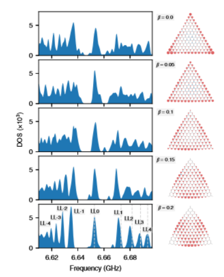 在變形蜂窩狀網格中,通過使用排列的耦合微波諧振器陣列,我們實驗觀察到了整個分頻過程中偽朗道能級從消失到大偽磁場強度的形成。通過利用所有場強中,與偽朗道水平兼容的幾何形狀中的自適應設置,可以實現此結果。所采用的方法使我們能夠在光譜上觀察到完整形成的“平帶”偽朗道能級,成為狀態光子密度中的尖峰,并在空間上對相關的波函數進行成像,在此我們為特征性結點結構提供了清晰的證據,反映了基礎低能理論中以前難以捉摸的超對稱性。特別地,我們解決了異常第0個偽朗道層的全子晶格極化,這揭示了在無應變情況下與之字形邊緣狀態的深層聯系。