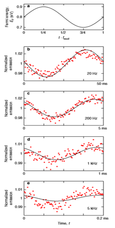 將單光子發射器的量子光學特性與納米光子和等離子體系統中強大的近場相互作用相結合,是創建量子操作和計量功能的有效方法。在這方面,主動和動態調節發射器-環境相互作用的能力特別重要。雖然熱調制、機械調制和光調制已相繼被證明,但電氣調制仍然是一個突出的挑戰。在此,我們通過原位調整石墨烯的費米能量,實現了快速、全電調制鉺發射體納米層與石墨烯之間的近場相互作用。我們展示了強大的相互作用,對于約25%的發射器,衰減率提高了1000倍以上,并以高達300 kHz的頻率對這些相互作用進行了電調制,比發射器的輻射衰減(約100 Hz)快幾個數量級。這為集成量子技術提供了一個有利的平臺,為通過控制波形的集體等離子體發射或光子發射來產生量子糾纏開辟了途徑。