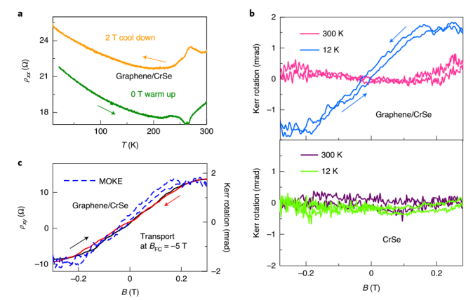 開發(fā)低耗散、長距離自旋輸運(yùn)的石墨烯基多功能自旋電子器件,需要石墨烯中的自旋分裂。磁性鄰近效應(yīng)是在材料中實現(xiàn)交換分裂的一種有效途徑,否則該分裂本質(zhì)上是非自旋極化的。在這里,我們表明,單層石墨烯可通過與硒化鉻的反鐵磁薄膜耦合而磁化,從而在2 K時產(chǎn)生高達(dá)134 meV的交換分裂能。這種交換分裂通過量子霍爾平臺的位移和石墨烯中的量子振蕩表現(xiàn)出來,其能量可以通過場冷卻進(jìn)行調(diào)制,隨著正場冷卻交換分裂能量增加,隨著負(fù)場冷卻交換分裂能量減少。我們對低溫下石墨烯磁性的實驗演示,得到了電阻率隨溫度變化的測量結(jié)果和磁光克爾測量結(jié)果。
