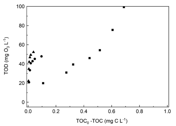 Figure 3. 草酸催化臭氧化過(guò)程中,TOC消除后TOD的變化。GO/TiO