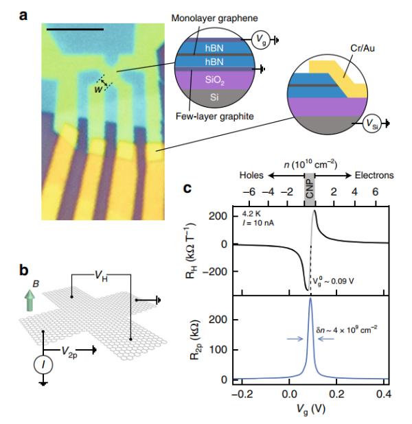 Figure 2. 超凈石墨烯霍爾傳感器。(a)裝置G1的光學照片,(b)測量裝置的示意圖,(c)霍爾系數RH的頂柵電壓(Vg)和和兩點電阻R2p的依賴性,條件:在4.2 K下,小交流偏壓,背景場B=100 mT。