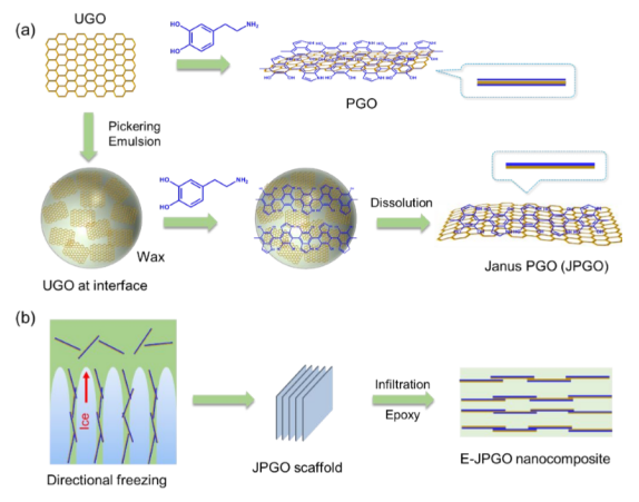 Figure 1. 制造 (a) JPGO和(b) E-JPGO納米復合材料的示意圖。