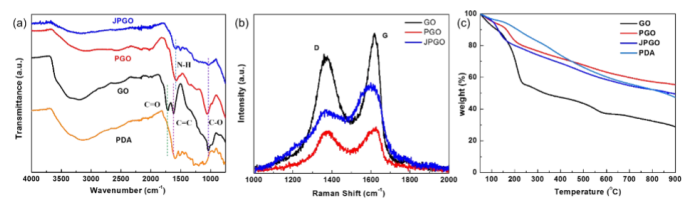 Figure 3. GO、PGO、JPGO和PDA的(a) FTIR光譜,(b)拉曼光譜和(c) TGA曲線。
