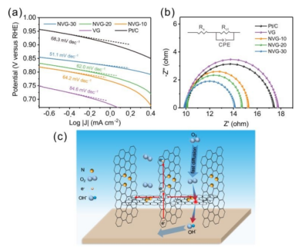 Figure 4.(a)Tafel斜率和(b)各種催化劑的奈奎斯特圖(插圖為當(dāng)量電路)。(c)在相互連接的垂直定向結(jié)構(gòu)中增強(qiáng)的電子轉(zhuǎn)移示意圖。