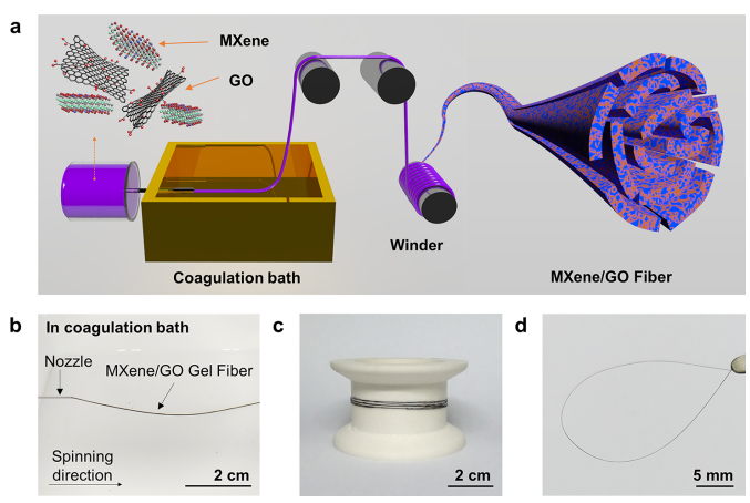 Figure 2. (a)MXene/GO混合纖維紡絲過程的示意圖;(b)MXene/GO凝膠纖維從噴嘴到熔池的狀態(tài)照片;(c)纏繞的MXene/GO混合纖維的線軸長1.2 m;(d)MXene/GO纖維(40重量%MXene)的柔軟性和彎曲性照片。