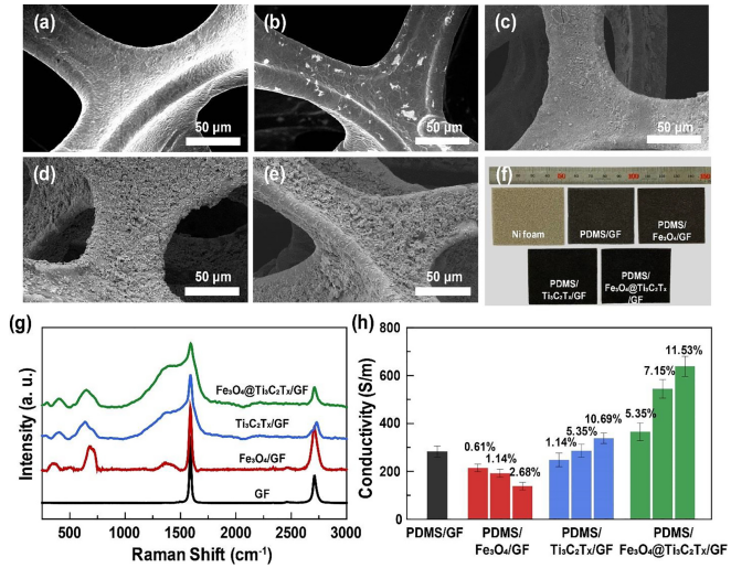 X雜化物/GF的SEM圖。(f)圖片。(g)拉曼光譜。(h)電導率。