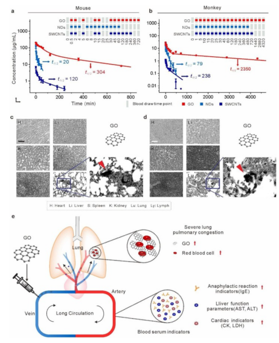 在大規模工業生產和臨床轉化潛力的背景下,對氧化石墨烯(GO)的毒理學評估一直在積極進行。盡管如此,GO的安全性仍存在很大爭議,特別是由于在高等哺乳動物中缺乏毒理學特征。在這里,我們表明,血液暴露低于最大安全起始劑量,接觸到GO可能導致哺乳動物意外死亡,包括非人類靈長類動物(1 / 5的獼猴和7 / 121只小鼠),而在其他動物中仍然可以普遍接受。在死亡動物中發現了較高的免疫球蛋白E水平和嚴重的肺損傷,表明GO誘發了急性過敏反應。值得注意的是,我們沒有觀察到其他兩種碳納米材料(包括單壁碳納米管和納米金剛石)的過敏反應和死亡。這種差異可能是由于二維GO材料在體內的循環時間較長所致。因此,這項研究凸顯了評估石墨烯和其他納米材料超敏風險的緊迫性。