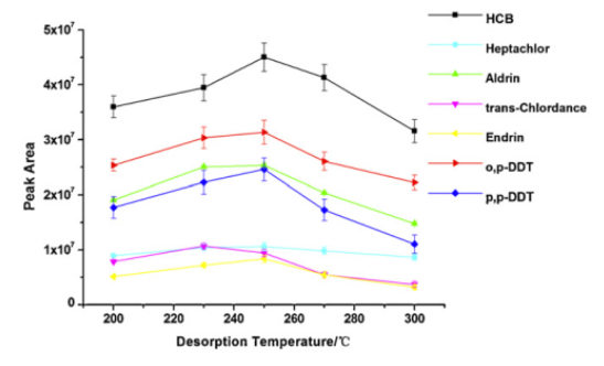 Figure 5.解吸溫度對OCPs萃取效率的影響。萃取時間25分鐘,其他萃取條件與Fig.3相同。