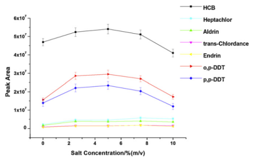 Figure 6. 鹽濃度對OCP萃取效率的影響。萃取時間25分鐘,其他萃取條件與Fig.3相同。
