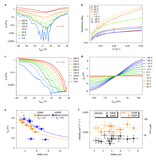 Fig. 4 h-BN中相對較寬的GNrs中的場效應和磁電特性。