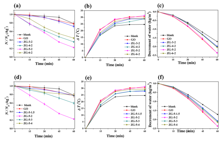 Figure 6. ZG-X-2膜含不同Co(NO3)2·6H2O濃度時,其相應的(a)Ag+光還原過程,(b)溫度演變,(c)水重量衰減曲線,ZG-5-Y膜含2-MIM/Co(NO3)2·6H2O不同摩爾比時,相應的(d)Ag+光還原過程,(e)溫度演變,(f)水重量衰減曲線。