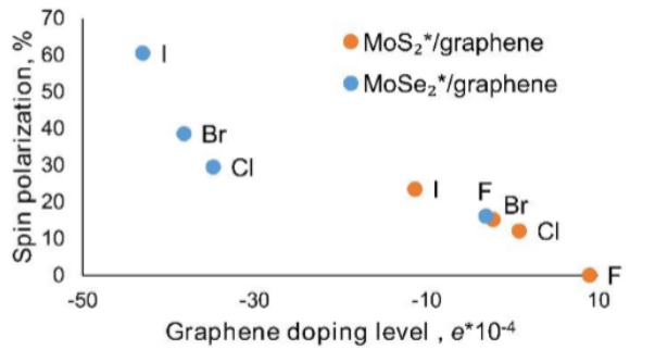 */石墨烯異質結構中在石墨烯處感應的自旋極化對石墨烯摻雜水平的依賴性。