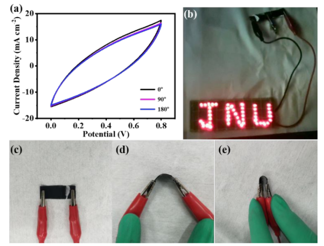 Figure 5.(a)柔性超級(jí)電容器在初始和彎曲狀態(tài)下的CV曲線,(b)兩個(gè)超級(jí)電容器串聯(lián)時(shí)并點(diǎn)亮紅色LED的光學(xué)圖像。(c,d,e)柔性超級(jí)電容器在0°,90°和180°彎曲狀態(tài)下的光學(xué)圖像。
