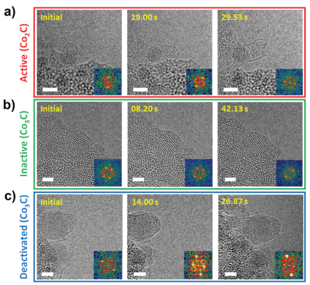 Figure 2.納米顆粒失活過程。(a)Co2C相催化劑顆粒的初步形成;(b)剝離;(c)隨著納米顆粒從原始Co2C相轉(zhuǎn)變?yōu)镃o3C相而最終失活。