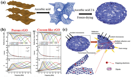 Figure 2. a)多孔繭狀RGO的制造過程示意圖。b)計(jì)算不同厚度樣品的RL,以及多孔R(shí)GO和類繭形RGO的阻抗匹配和頻率之間的關(guān)系。c)多孔繭狀RGO的MA機(jī)制的示意圖。